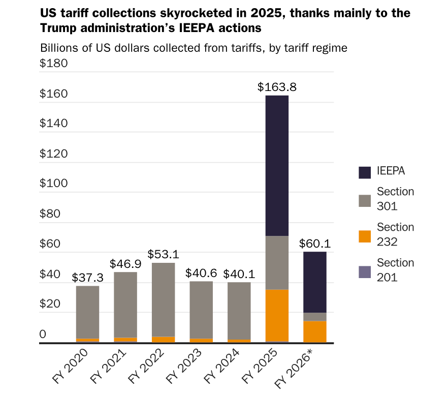 It may take time for the future of Trump’s 2025 trade deals to become clear. However, the decision does raise one immediate question for US companies: are they entitled to reimbursement for profits lost to illegal tariffs? While Customs and Border Protection havean outlined protocol regarding refunds, SCOTUS did not weigh in on the potential idea of refunding those affected by the IEEPA framework. In total, experts estimate that close to $150 billion in duties has been collected by the U.S. due to IEEPA alone. This graph from the Cato Institute visualizes the impact IEEPA has had on U.S. importers.