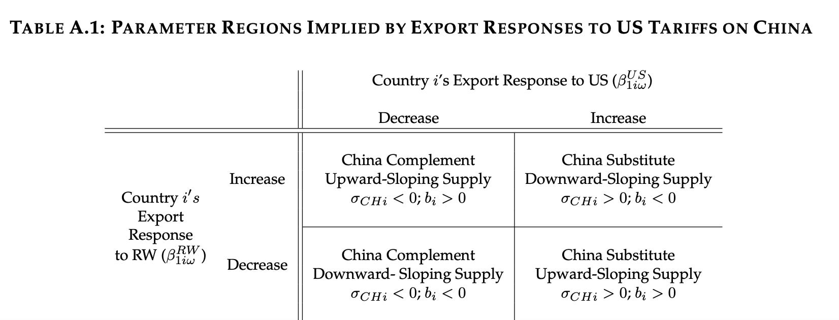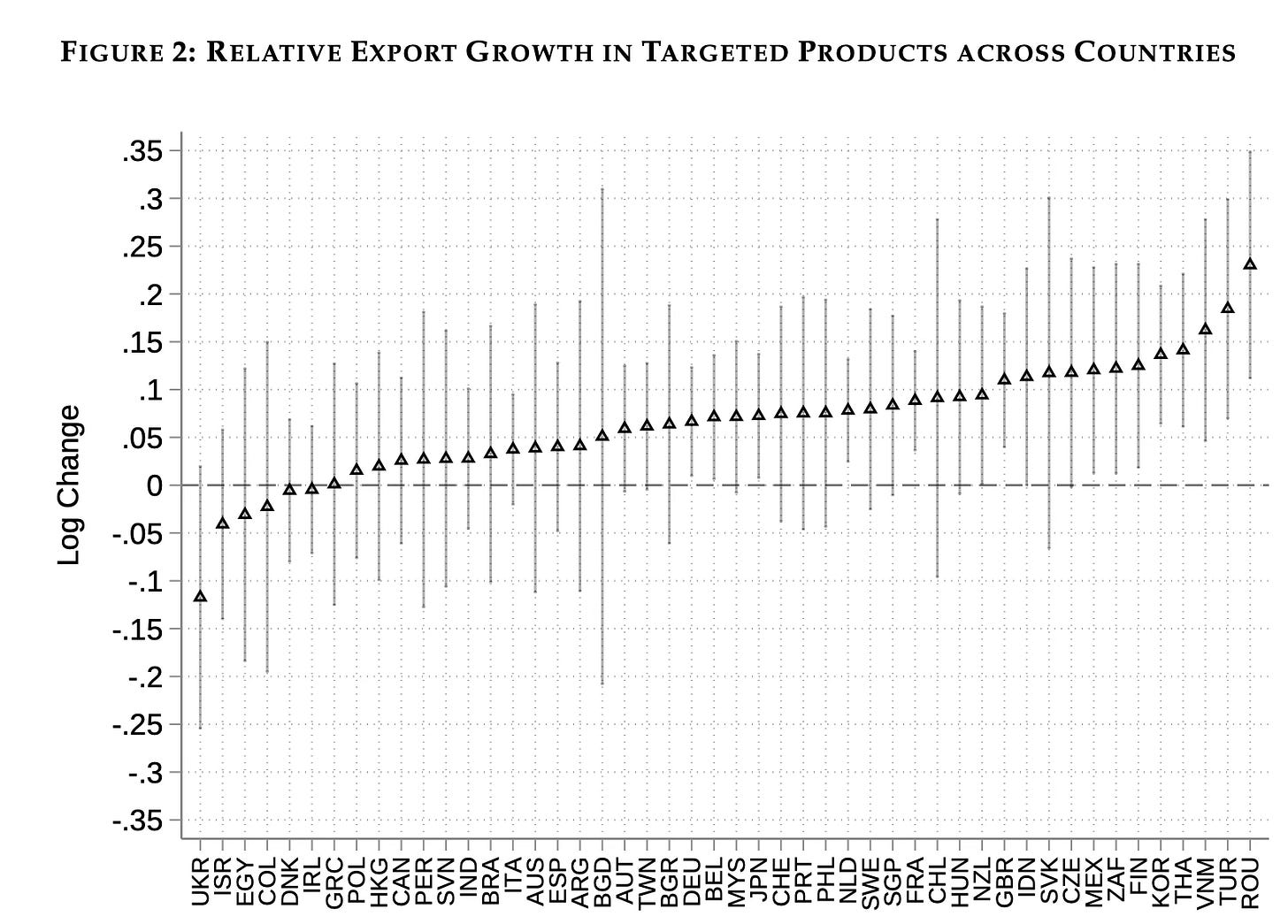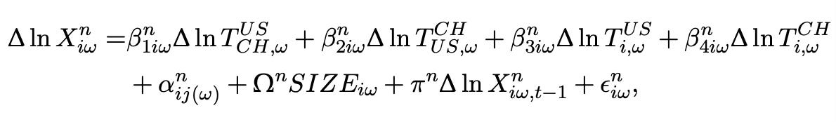 To analyze the data, the team estimated a rather complicated looking formula that predicts the change in a country’s exports using the impacts of tariffs from the US and China on each other and bystanders, as well as the original size of the trade flowbetween the country and the US, China, and bystander countries, and a few control variables.
