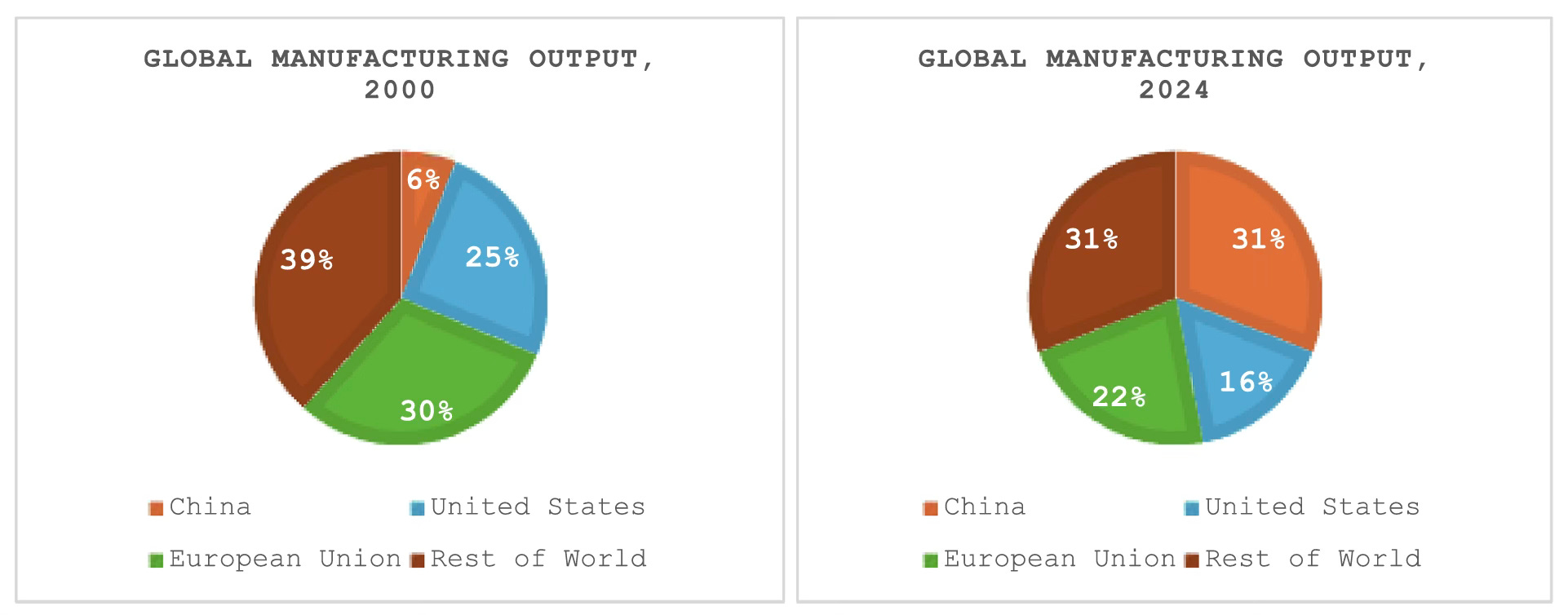 To support their arguments about neomercantilism, the researchers examined the growth in manufacturing output. The total manufacturing output of China, United States, and the EU made up approximately 61% of the total global manufacturing output in 2000, but in 2024, they made up 69%. This overall growth in the amount of concentration in manufacturing suggests that major powers have strengthened their economic dominance. This development crowds out other countries, preventing them from participating in global manufacturing output.